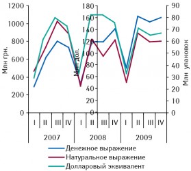 По итогам 2009 г. лечебно- профилактическими учреждениями (ЛПУ) было закуплено 212,5 млн упаковок ЛС на сумму 3,7 млрд грн. В долларовом эквиваленте этот показатель составил 470,6 млн дол., уменьшившись на 13,7% по сравнению с 2008 г. (рис. 2).