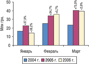 Общий объем импорта ГЛС по итогам I кв. 2006 г. составил 1168,2 млн грн. в денежном выражении и 5189,2 т в натуральном, превысив показатели аналогичного периода 2005 г. на 24,6 и 20,7% соответственно (рис. 1). При этом объем импорта в марте 2006 г. достиг отметки в 502,2 млн грн. и 1970,7 т (рис. 2, 3). Отметим, что показатели марта превысили таковые аналогичного периода прошлого года всего на 13,4 и 0,3% соответственно, что намного ниже показателей прироста, отмеченных в первые два месяца 2006 г. Однако следует учесть, что именно в марте прошлого года были отмечены максимальные за весь 2005 г. показатели прироста объемов поставок ГЛС относительно аналогичного периода 2004 г. (76,6 и 48,7% в денежном и натуральном выражении соответственно), что и привело к, казалось бы, незначительному увеличению объемов импорта в марте 2006 г. Между тем, очевидно, что объем импорта ГЛС с начала 2006 г. уверенно возрастает, покоряя все новые и новые вершины.