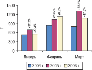 Рис. 3. Динамика объема импорта ГЛС в натуральном выражении в январе–марте 2004, 2005 и 2006 гг. с указанием процента прироста/убыли по сравнению с предыдущим годом