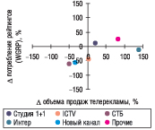 Описанная выше эволюция естественным образом отразилась на распределении долей крупнейших телеканалов по основным медиа-показателям. Так, удельный вес «Студии 1+1» в общем количестве выработанных рейтингов существенно увеличился по сравнению с апрелем 2005 г., тогда как в общем объеме продаж телерекламы доля этого канала осталась практически на уровне прошлого года (рис. 6). В случае Интера ситуация повторилась с точностью до наоборот — обеспечив более низкий уровень контакта со зрителем, чем в прошлом году, этот канал аккумулировал почти на 150% больше рекламных бюджетов, чем в апреле 2005 г.