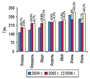 Рис. 3. Динамика стоимости 1 весовой единицы импортируемых ГЛС в январе–июле 2004, 2005 и 2006 гг. с указанием процента прироста/убыли по сравнению с предыдущим годом