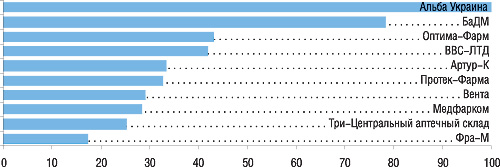 В анкетах 79 респондентов упоминалось 38 компаний 11–20-е места в рейтинге заняли: Фра-М, Вента, Медфарком, Юнифарма, Мегсифарм, Аптечные склады Фарма Киев, Медфармсервис, Эдельвейс, Оптовая компания «Дарница», Себ–Фармация