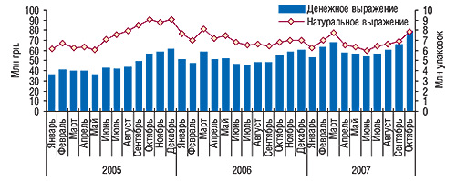 Рис. 1. Динамика объемов аптечных продаж антибактериальных средств в денежном и натуральном выражении за январь 2005–октябрь 2007 г. |