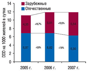 Лидерами по объему потребления антибактериальных средств, выраженному в DDD на 1000 жителей в сутки, являются отечественные препараты (рис. 7). На протяжении первых 10 мес 2007 г. 6,30 из 11,84 DDD на 1000 жителей в сутки обеспечивали отечественные производители. Однако по сравнению с первыми 10 мес 2007 г. потребление антибактериальных средств отечественного производства уменьшилось на 7,6%.