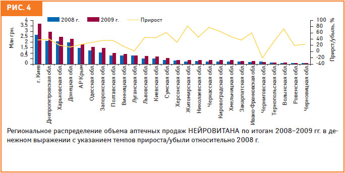 В целом региональное распределение объе­ма аптечных продаж НЕЙРОВИТАНА свидетельствует о том, что максимальную выручку он приносит столичным аптечным учреждениям, а также таковым в других крупных регионах, таких как Днепропетровская, Харьковская области и др. (рис. 4). По итогам 2009 г. максимальное увеличение объема продаж НЕЙРОВИТАНА в денежном выражении (свыше 60%) отмечают в аптечных учреждениях 6 регионов, например в Сумской, Житомирской и других областях.