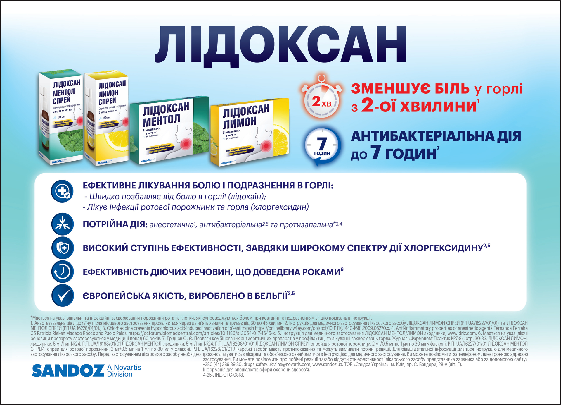 - Інструкція для медичного застосування лікарського засобу ЛІДОКСАН ЛИМОН СПРЕЙ (РП UA/16227/01/01) та ЛІДОКСАН МЕНТОЛ СПРЕЙ (РП UA/16228/01/01).
