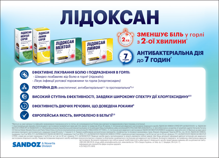 Лікувальний ефект препарату Лідоксан починається одразу, тобто миттєво, і триває до 7 год [9, 10]. Лікарська форма спрею дає можливість таргетної доставки високої концентрації діючої речовини до задньої стінки глотки, а льодяники — більш високе початкове осадження активних інгредієнтів у роті та горлі й більш повільні показники кліренсу порівняно з аерозолями та полосканнями горла. Застосовується у дітей віком із 6 років.