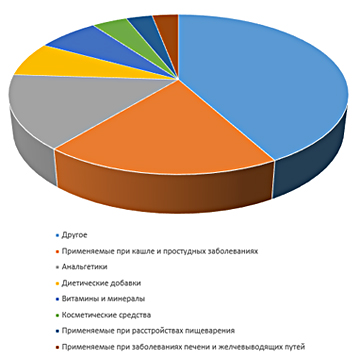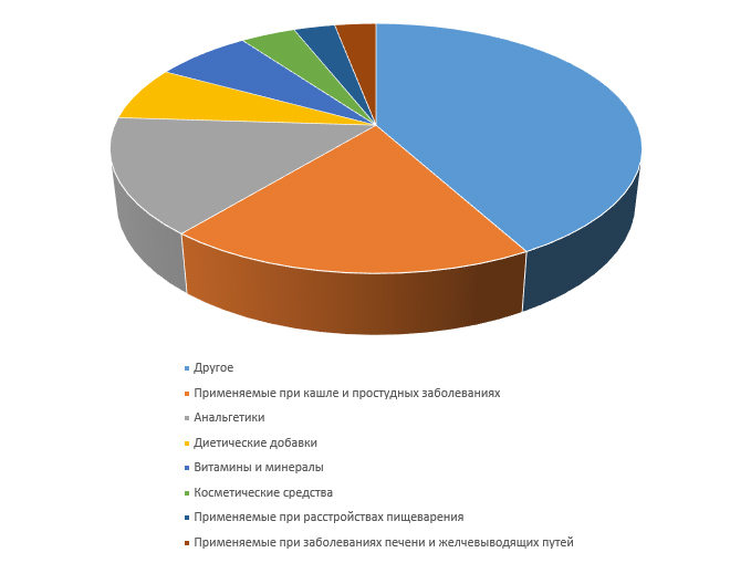 Распределение бюджетов по группам продуктов в фармацевтическом секторе было следующим: лекарственные средства, применяемые при кашле и простудных заболеваниях (19%), анальгетики (15%), диетические добавки и витамины с минералами (по 7%), косметические средства (4%), препараты, применяемые при расстройствах пищеварения и заболеваниях печени и желчевыводящих путей (по 3%) (рисунок).