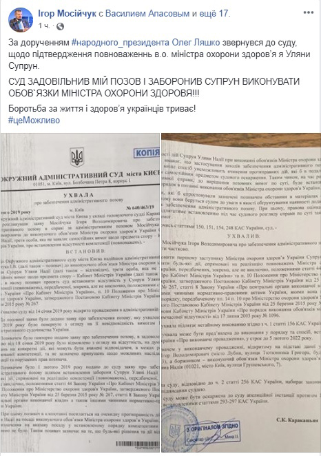 Копію відповідного рішення оприлюднив на своїй сторінці в соціальній мережі Facebook нардеп від Радикальної партії Ігор Мосійчук, який виступає позивачем. «Суд задовольнив мій позов і заборонив Супрун виконувати обов’язки міністра охорони здоров’я!!!», — прокоментував він.
