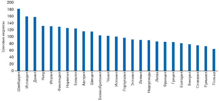 В анализ включены в общей сложности 2720 лекарственных средств (виртуальных продуктов), удовлетворявших критериям включения, и использованы так называемые максимальные официальные цены (с наценками и НДС), без учета возвратов и скидок. PLI определяли согласно методике Евростата, то есть как частное от деления ППС на текущий обменный курс. Разброс показателей — от 182 (в Швейцарии) до 64 (в Польше) (рисунок). Сравнительно высокий показатель Чехии объясняется тем, что там фактические розничные цены примерно на 20% ниже максимальных.