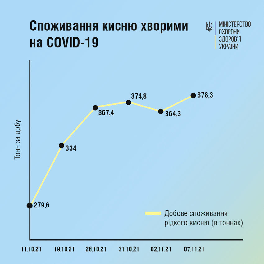 Загальне виробництво профільними підприємствами кисню зараз становить близько 400 т на добу. За цей же час добове споживання балонів із газоподібним киснем зросло майже вдвічі. Так, якщо 19 жовтня по всій Україні було використано 6841 балон, то вже 7 листопада — 11 594 балони. При цьому в середній лікарні, яка приймає хворих на COVID-19, одного балону газоподібного кисню вистачає на 15–30 хв роботи.