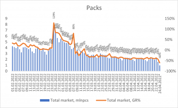 On the first day of military aggression, pharmacy sales of drugs more than doubled compared to the same day last year, and grew at a high rate in the first 11 days of the war. Currently, sales are declining and show negative growth rates compared to the same period last year, and are lower than in the pre-war period (Fig. 1). This is due not to a decrease in demand, but to a limited number of working pharmacies, their opening hours, limited supplies, a large number of people who went abroad, foreign humanitarian aid, as well as the population stocking up.