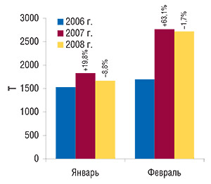В феврале 2008 г. активность импортеров ГЛС была практически в 2 раза выше, чем в январе. Также сохранилась и тенденция к значительному увеличению объемов поставок по сравнению с предыдущим годом. Так, объем импорта ГЛС в Украину в феврале 2008 г. составил 851,7 млн грн. в денежном выражении, что превысило показатели аналогичного периода 2007 г. на 27,3% (рис. 1). И это при том, что годом ранее процент прироста объемов ввоза ГЛС составлял более 70% (!). С другой стороны, следует констатировать некоторое уменьшение объемов импорта этого вида продукции в натуральном выражении. В исследуемый период он составил 2,7 тыс. т, что на 1,7% меньше, чем было в феврале 2007 г. (рис. 2).