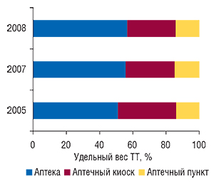 Около половины аптечных учреждений России в настоящее время входит в состав аптечных сетей, организуемых государственными, муниципальными предприятиями, акционерными обществами и индивидуальными предпринимателями. При этом их доля на рынке постепенно увеличивается и, по ожиданиям экспертов, в 2008 г. уже сможет превысить отметку 60%.