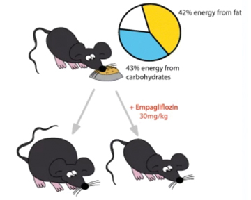 У результаті у мишей, які отримували харчування за дієтою західного типу, відмічали надлишкову масу тіла, гіперглікемію, гіперінсулінемію та резистентність до інсуліну через 10 тиж. Приймання емпагліфлозину запобігало цим метаболічним змінам. У той час як споживання води було значно збільшено при додаванні емпагліфлозину, кількість вжитого корму залежно від цього не змінювалася. Депо жирової тканини, виміряні за допомогою магнітно-резонансної томографії, були значно меншими у мишей, які отримували емпагліфлозин на фоні західної дієти, ніж в особин, які препарат не отримували. Крім того, додавання емпагліфлозину запобігало значному стеатозу. Відповідно, чутливість клітин печінки до інсуліну погіршилася у мишей, що не отримували емпагліфлозин. До того ж додавання емпагліфлозину позитивно вплинуло на розмір і морфологію мітохондрій у скелетних м’язах мишей, яких годували за обома типами дієти.