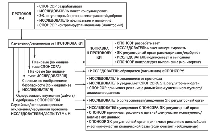 До начала каждого КИ представители спонсора просят исследователя подписать протокол рядом с подписью представителей спонсора на так называемой подписной странице. Этим он подтверждает, что ознакомился с представленным протоколом и согласен следовать ему при проведении КИ. Дополнительно обязательство следовать утвержденному протоколу КИ (наравне с требованиями Руководства по надлежащей клинической практике, национальному законодательству и т.д.) содержится также и в контракте, который заключается между спонсором (или его представителем) и ответственным исследователем (и/или медицинским учреждением, в котором он работает). Кроме этих двух документов, исследователя часто просят подписать форму Управления по контролю за пищевыми продуктами и лекарственными средствами США (Food and Drug Administration — FDA) FDA 1572 (для исследований, результаты которых будут подаваться в управление), в которой также прописано обязательство исследователя строго следовать протоколу. Безусловно, это требует от ответственного исследователя, а также его сотрудников и помощников хорошего знания содержания протокола.