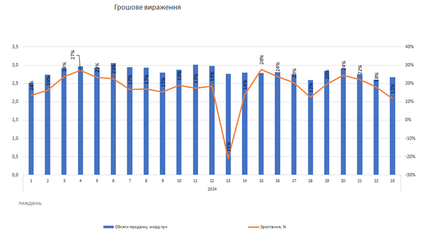 Розглядаючи поденну динаміку аптечного продажу ліків, можна відзначити тенденцію до погіршення показників динаміки відносно аналогічного періоду минулого року. Станом на 11.06.2024 р. зростання у гривневому вираженні становить 11,9%, а у натуральному фіксується спад на 5% порівняно з аналогічним днем (з урахуванням відповідного дня тижня) минулого року (рис. 2). Крім того, наразі показники динаміки дещо кращі, ніж в аналогічний день минулого тижня.