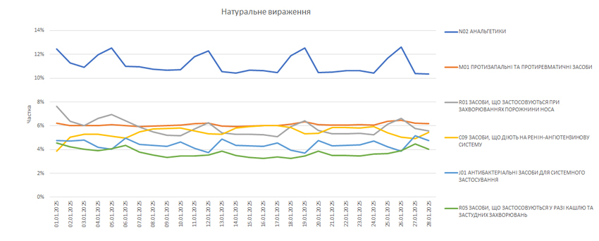 Поденна динаміка роздрібної реалізації ліків свідчить, що на початку 5-го тижня цього року показники динаміки залишаються стабільними та приблизно дорівнюють таким попереднього тижня. Як свідчить практика, обсяги продажу ліків збільшуються ближче до кінця тижня, тож можна очікувати на покращення показників розвитку наступного тижня. Станом на 28.01.2025 р. зростання у гривневому вираженні становить 16,5%, а у натуральному зафіксовано зниження на 4,3%, порівняно із аналогічним днем (з урахуванням відповідної доби тижня) минулого року (рис. 2). Загалом же за період з 1 до 28 січня 2025 р. обсяги аптечного продажу ліків зросли на 18,6% у грошовому вираженні, а у натуральному зменшилися на 3,7%.