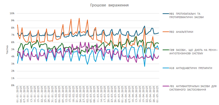 У розрізі груп АТС-класифікації 2-го рівня фіксується зростання частки препаратів групи M01 «Протизапальні та протиревматичні засоби». Також збільшилася частка антидіабетичних препаратів (рис. 3).