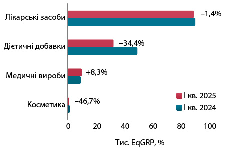 Показник EqGRP** теж відновився лише частково (рис. 2). Порівняно з аналогічним періодом попереднього року за підсумками І кв. 2025 р. зафіксовано його зниження на 12,1% (рис. 3). Це контрастує з динамікою попереднього року, коли ринок демонстрував активне зростання. Зниження зумовлене негативною динамікою в категоріях косметики та дієтичних добавок (рис. 4). Водночас у сегменті лікарських засобів показник EqGRP залишився майже на рівні минулого року, а в категорії медичних виробів зафіксовано приріст.