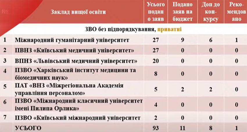 Що стосується ж приватних «вишів», то статистика взагалі жалюгідна — 1 людина, рекомендована до зарахування, з 93 поданих заяв (рис. 2).