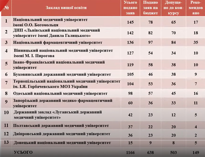 На жаль, саме така криза в освіті спостерігається в Україні, де вже другий рік поспіль у закладах вищої освіти фіксуються доволі негативні тенденції при вступі. Так, на початку своєї доповіді Р. Яцишин зазначив, що цього року кількість студентів, рекомендованих до зарахування, є вкрай малою. Зокрема, у всіх 13 закладах вищої освіти, підпорядкованих Міністерству охорони здоров’я (МОЗ) України, де готують фахівців за напрямком «І8 Фармація» (денна форма навчання), цьогоріч зафіксовано загалом 1166 поданих заяв абітурієнтів, з яких лише 149 осіб отримали статус «рекомендовано до зарахування». Якщо ж розглянути картину в розрізі кожного взятого закладу освіти окремо, то цифри будуть ще більш вражаючі — від 2 до 35 майбутніх студентів на курс (рис. 1).