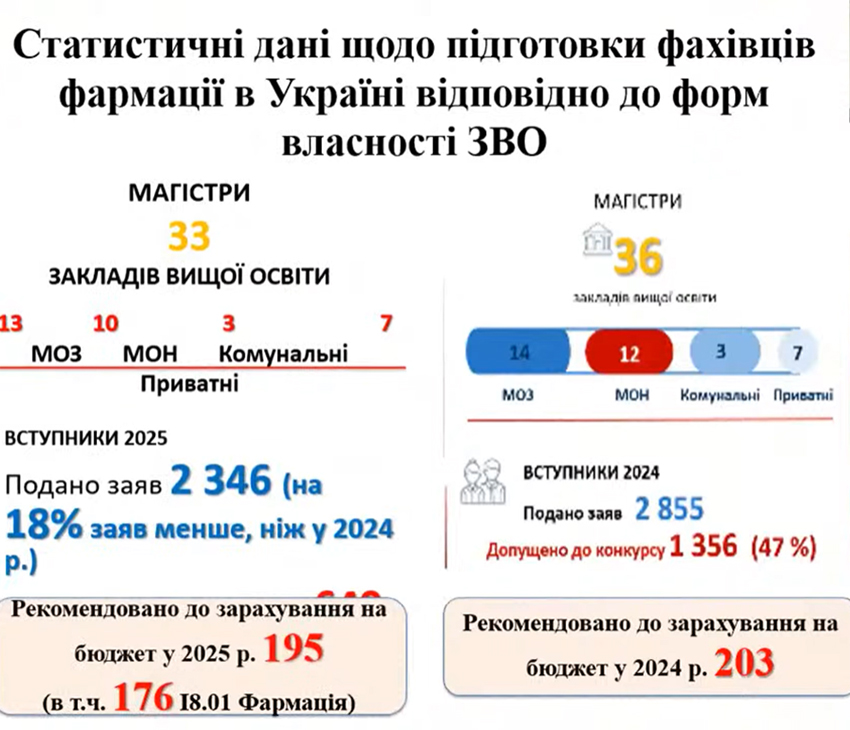 - виклики війни та міграційні процеси (втрата матеріально-технічної бази у прифронтових регіонах, зменшення кількості студентів, особливо іноземних, що позначається на фінансуванні закладів вищої освіти, потреба в підготовці фармацевтів для військової медицини та реабілітації);