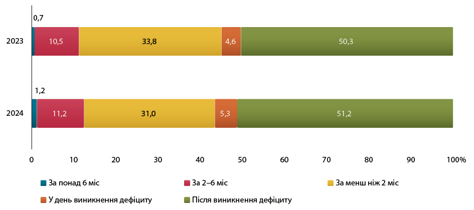 Рис. 2. Своєчасність повідомлень у EMA про дефіцит лікарських засобів, дозволених централізовано, з травня 2023 до кінця жовтня 2024 р.