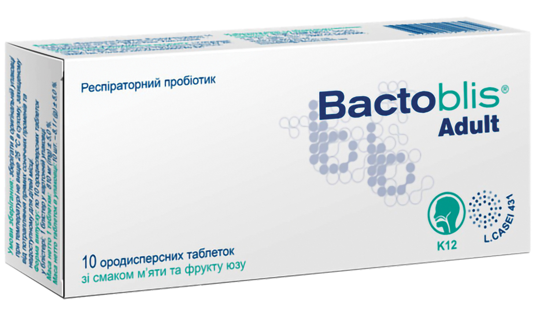 Оральна дієтична добавка Бактобліс для дорослих — респіраторний пробіотик, у складі якого наявна комбінація штаму Streptococcus salivarius K12 та Lactobacillus casei 431®, властивості останніх спрямовані на підтримку місцевого імунітету, зниження захворюваності та полегшення перебігу інфекцій.