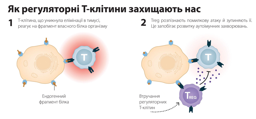 Пізніше вчені пов’язали ці два відкриття. Вони довели, що ген Foxp3 відіграє важливу роль у розвитку регуляторних Т-клітин, які контролюють інші Т-клітини, запобігаючи атаці на власні тканини організму (рисунок), а також заспокоюючи імунну систему після знищення «зловмисника», щоб вона не продовжувала працювати на повній потужності.
