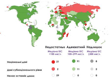 Особливо тривожною є ситуація у Східній Європі, у тому числі й в Україні, де з 1990 до 2019 р. зафіксовано суттєве зростання поширеності дефіциту йоду (+5,5% за досліджуваний період) (Lin J. et al., 2025). У проведеному національному дослідженні зафіксовано наявність йодного дефіциту на всій українській території (найбільш виражений дефіцит, що наближався до середнього ступеня, був встановлений у північному регіоні України) (Tronko M.D. et al., 2022). Ще більш тривожним є показник років життя, втрачених через непрацездатність, за підвищенням показника якого серед жінок репродуктивного віку (+16,8%) наша країна посіла 2-ге місце у світі після Лівії (Lin J. et al., 2025). Несприятлива ситуація й щодо виникнення вузлового зоба: наприклад, з 2016 до 2021 р. його поширеність серед українського населення зросла на понад 25% (Tovkai A.O., 2022). Описана проблематика невипадкова, адже, як свідчать дані Міжнародної мережі йоду (Global Iodine Network — IGN)4 (рисунок), Україна входить до переліку країн із недостатнім споживанням йоду, де мільйони українських дітей шкільного віку щодня недоотримують цей важливий мікроелемент3, в українських жінок репродуктивного віку досі відмічають легку форму дефіциту йоду (середній вміст у сечі становить 90 мкг/л), ставлячи Україну на останнє місце серед країн Європи та Азії за йодним статусом, як встановлено в дослідженні Дитячого фонду ООН (United Nations International Children’s Emergency Fund — UNICEF)5.