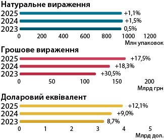 Загальні обсяги аптечного продажу товарів «аптечного кошика» за підсумками 9 міс 2025 р. становили 164,2 млрд грн, що на 17,5% більше порівняно із аналогічним періодом минулого року. У доларовому вираженні обсяги продажу в досліджуваний період становили 3,9 млрд дол. США та зросли на 12,1%. У натуральному вираженні обсяги роздрібної реалізації становили 948,2 млн упаковок, що на 1,1% менше, ніж в аналогічний період минулого року (рис. 1). Зниження споживання в натуральному вираженні значною мірою пов’язано зі скороченням кількості населення, що має доступ до ринку, через міграцію за кордон та природну депопуляцію (смертність перевищує народжуваність).