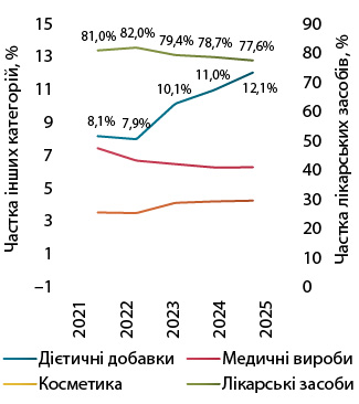Варто нагадати, що 27 березня 2025 р. набув чинності Закон України № 4122-IX щодо удосконалення регулювання виробництва та обігу харчових доповнювачів, який введено в дію з 27.09.2025 р. Тож у наступні періоди сегмент дієтичних добавок може зазнати змін.