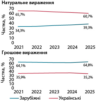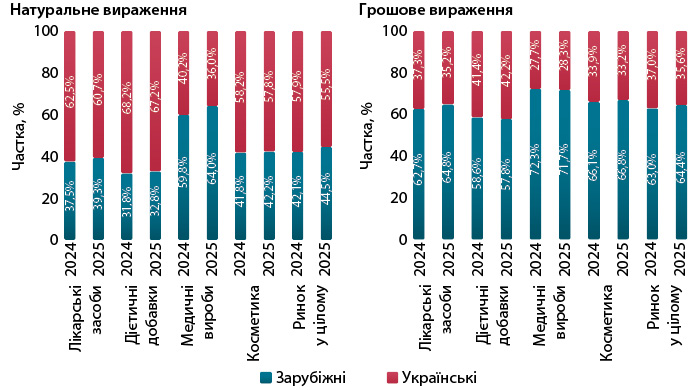У структурі роздрібної реалізації товарів українського та зарубіжного виробництва за 9 міс 2025 р. загалом по ринку відзначається збільшення частки зарубіжних товарів як у грошовому, так і натуральному вираженні порівняно із показниками за 9 міс 2024 р. (рис. 3). Втім у сегментах дієтичних добавок та медичних виробів українські виробники дещо збільшили свою частку у грошовому вираженні.
