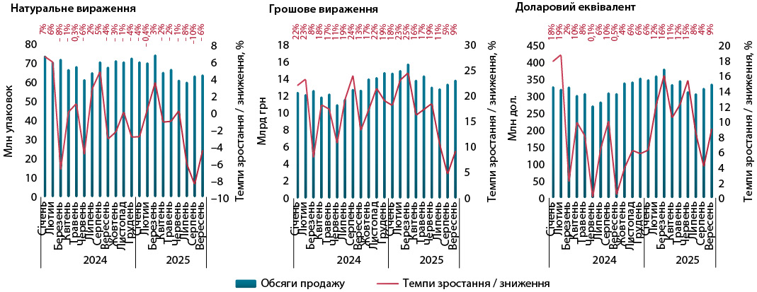 За підсумками 9 міс 2025 р., обсяги роздрібної реалізації лікарських засобів становили 127,4 млрд грн, або 3,1 млрд дол., що на 15,8% більше у гривневому вираженні та на 10,5% — у доларовому еквіваленті порівняно із показниками за аналогічний період минулого року. В упаковках обсяги роздрібної реалізації зменшилися на 3,3% та становили 603 млн упаковок.