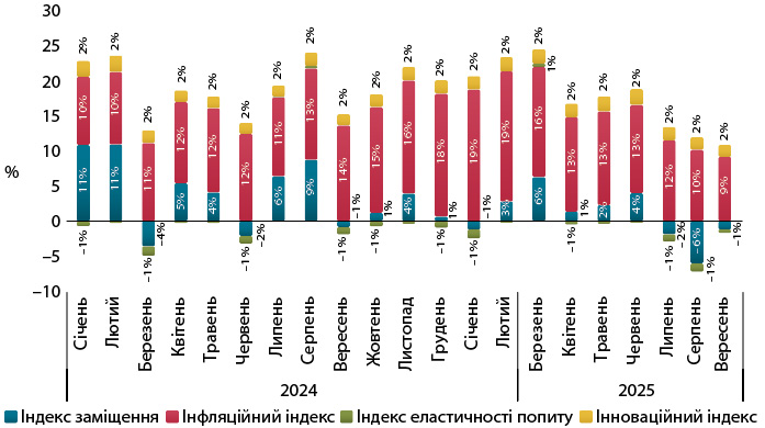 У досліджуваний період основним фактором зростання ринку у грошовому вираженні була інфляційна складова, яка відображає зміну обсягів аптечного продажу за рахунок зміни ціни. Однак її вплив поступово зменшується і у вересні становить 9%, що вдвічі менше, ніж на початку року (рис. 6). Для порівняння загальний рівень інфляції в країні у вересні 2025 р., за даними Державної служби статистики України, становив 11,9% порівняно із вереснем 2024 р., а зростання цін на фармацевтичну продукцію, медичні товари та обладнання — 10,8%.