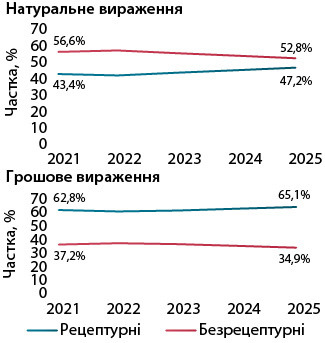 Незначний вплив на роздрібний ринок лікарських засобів також чинять державні ініціативи. Як відомо, з 1 березня 2025 р. відбулося декларативне зниження цін на визначені Міністерством охорони здоров’я (МОЗ) переліки препаратів. Ціни на ці ліки дійсно знизилися, а загальний вплив на ринок від цієї ініціативи становить близько –2% у грошовому вираженні. Також впроваджуються нові правила ціноутворення на лікарські засоби, які передбачають декларування цін у Національному каталозі цін. Вплив цієї ініціативи майже невідчутний, адже ціни знижені на незначну кількість препаратів.