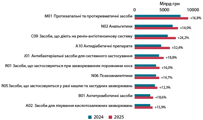 У розрізі АТС-класифікації 2-го рівня відзначається збільшення обсягів продажу ліків у грошовому вираженні для всіх АТС-класів із топ-10. При цьому активніше за інших за підсумками 9 міс 2025 р. зростали антидіабетичні та антигіпертензивні препарати АТС-групи С09 (рис. 9).