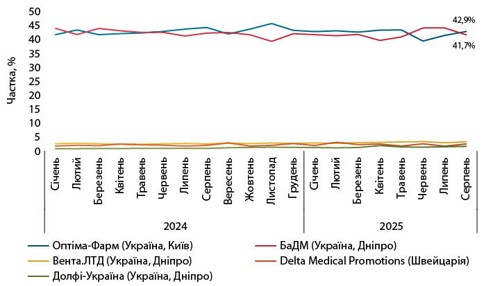 У сегменті дистрибуції за підсумками 9 міс 2025 р. лідируючі позиції за обсягами поставок товарів «аптечного кошика» в аптеки стали компанії «Оптіма-Фарм», «БаДМ» і «Вента.ЛТД» (рис. 10). Між лідерами сегмента триває жорстка конкурентна боротьба, яка супроводжується постійною зміною лідера.