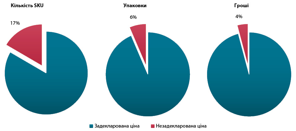 Загалом за 9 міс 2025 р. на роздрібному ринку реалізовувалося 10 399 товарних позицій (Stock Keeping Unit — SKU) лікарських засобів, з яких у Нацкаталозі задекларовано оптово-відпускну ціну для 8674 SKU. Тобто станом на 24 жовтня 2025 р. на понад 1700 SKU, що реалізуються на роздрібному ринку, не задекларовано ціни в Нацкаталозі. Отже, 17% від загальної кількості SKU можуть зникнути з полиць аптек. Водночас їх частка в загальному обсязі продажу ліків за 9 міс 2025 р. у натуральному та грошовому вираженні становить 6 і 4% відповідно (рис. 1).