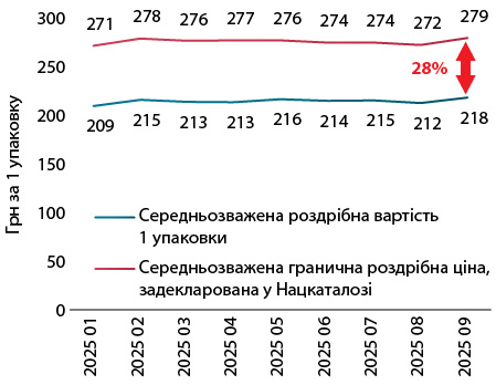 Щодо впливу декларування цін, то загалом задекларована в Нацкаталозі гранична роздрібна ціна вища за середньозважену роздрібну вартість у вересні 2025 р. в середньому на 28% (рис. 2).