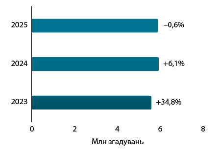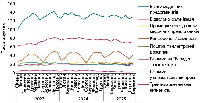 За підсумками 9 міс 2025 р. кількість згадувань спеціалістів охорони здоров’я про всі види промоції* товарів «аптечного кошика»** залишилася практично незмінною — зафіксовано 5,9 млн згадувань, що лише на 0,6% менше порівняно з аналогічним періодом попереднього року (рис. 1). Це свідчить про те, що загальний промоційний тиск залишається стабільним.