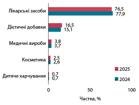 Основна частка промоційних згадувань традиційно припадає на лікарські засоби — 76,5% у досліджуваний період (рис. 2). На 2-му місці — дієтичні добавки з часткою 16,5%. Довготривалим трендом є зменшення частки лікарських засобів та зростання інтересу до дієтичних добавок.