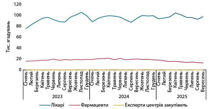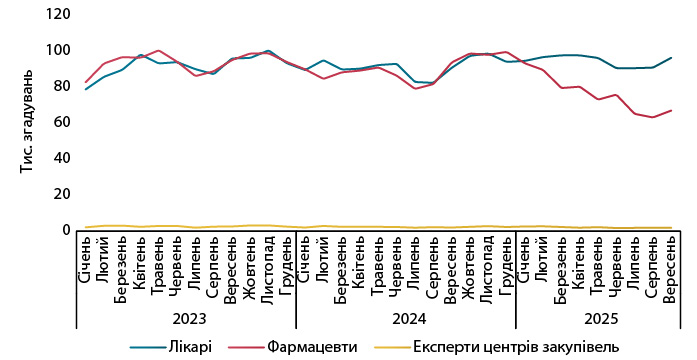 З 1 березня 2025 р. в Україні набула чинності заборона на укладання маркетингових договорів між виробниками лікарських засобів та аптечними мережами. Це рішення позначилося на структурі промоактивності: у згадуваннях про промоцію серед фармацевтів зафіксовано відчутний спад, тоді як в аудиторії лікарів — помірне зростання (рис. 3).