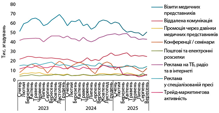 Зміни в каналах просування стали ще одним показовим трендом 2025 р. У сегменті ОТС-препаратів зменшилася кількість згадувань про промоцію через візити медичних представників та трейд-маркетингову активність (рис. 6). Водночас зростає частка згадувань про промоцію через медіа (ТБ, інтернет, радіо) та віддалену комунікацію.