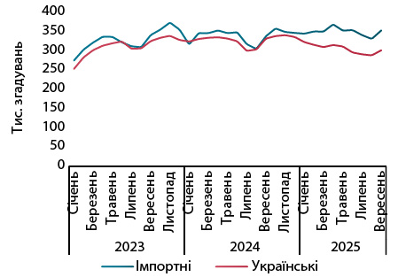 Ще один помітний вектор змін — у балансі активності між українськими та зарубіжними виробниками. Якщо в попередні роки вітчизняні компанії активно конкурували за комунікаційний простір, то 2025 р. відзначився спадом їхньої промоційної наявності (рис. 8). Натомість зарубіжні бренди демонструють підвищення активності.