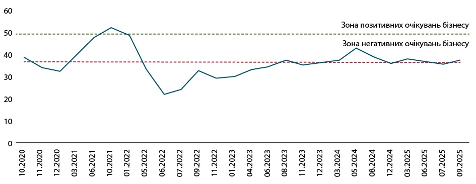 За результатами дослідження, індекс ділової активності UBI (Ukrainian Business Index), розрахований станом на вересень 2025 р., становить 37,9 бала зі 100 можливих (рис. 1). Цей показник продемонстрував незначне зростання порівняно з попередніми хвилями досліджень (36,1 у липні 2025 р. та 36,9 на початку року), однак він все ще перебуває у зоні негативних очікувань.