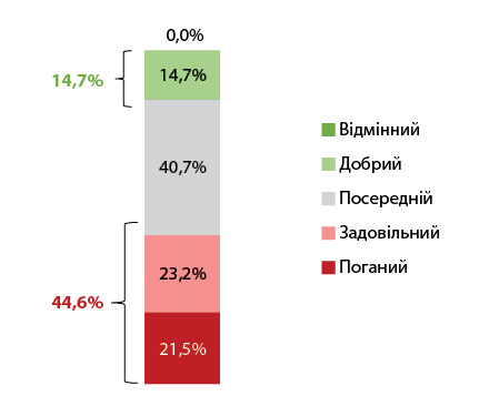 Оцінка фінансово-економічного стану компаній є переважно обережною. Зокрема, 44,6% респондентів охарактеризували стан свого підприємства як поганий або задовільний, ще 40,7% — як посередній. Лише 14,7% респондентів відзначили, що їхня компанія перебуває у хорошому або відмінному фінансовому стані (рис. 2).
