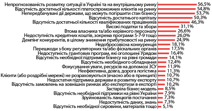 Серед топ-5 основних проблем (рис. 4), що перешкоджають відновленню та зростанню економічної активності підприємств, компанії, які взяли участь в опитуванні, виділили наступні: