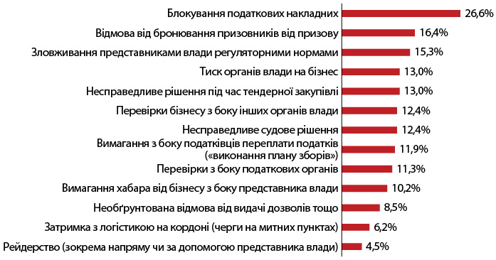 Серед основних проблем у взаємодії з органами державної влади було відзначено наступне: блокування податкових накладних (26,6%), відмова у бронюванні співробітників (16,4%), зловживання регуляторними повноваженнями з боку представників влади (15,3%), а також тиск з боку органів влади на бізнес (13,0%) (рис. 5).